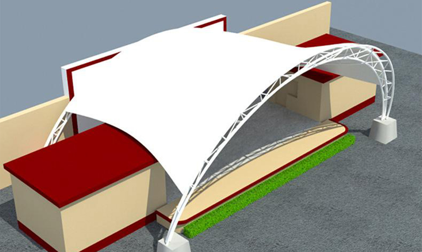 1、舞臺(tái)張拉膜結(jié)構(gòu)的共同曲面外形使其具有激烈的雕塑感,膜面經(jīng)過(guò)張力到達(dá)自平衡。