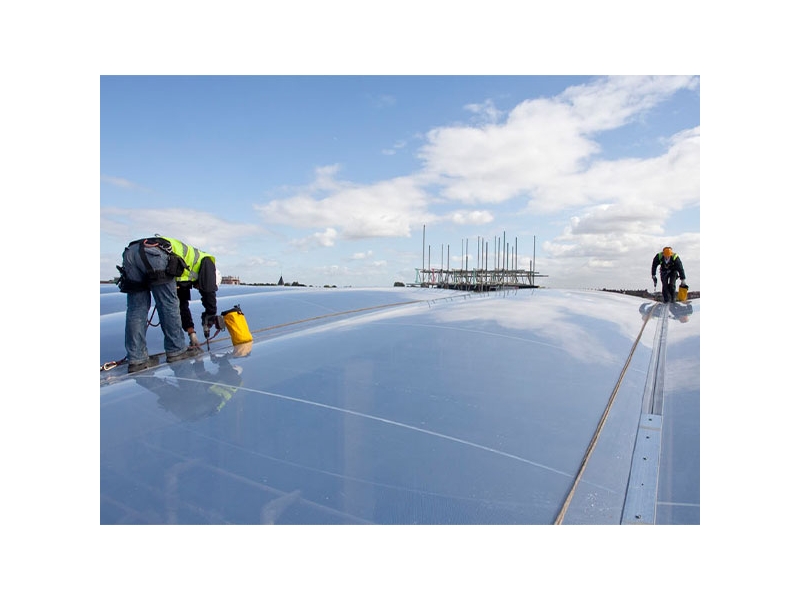 ETFE膜結構由鋁型材邊框將氣枕邊緣固定然后支撐在輕型鋼結構上,氣枕由低氣壓充氣使其能夠隔熱并承受風載。氣枕由多層膜加工制作而成,不會因紫外線照射或大氣污染而發生質量退化,ETFE膜材最大透光率可達94-97%,使用壽命極長,膜表面光滑可抗灰塵附著,在雨季,整個外表面只靠雨水沖刷即可;ETFE可做成多層膜系統,或加印花圖案,用不同顏色等方式來渲染建筑外形,同時還可在每層膜上加LED燈。ETFE膜材含有氟元素為不易燃材料,而且可以自滅,而且膜材本身具有韌性及很高的抗撕裂能力,在拉長300%至400%的條件下仍保持高強度。